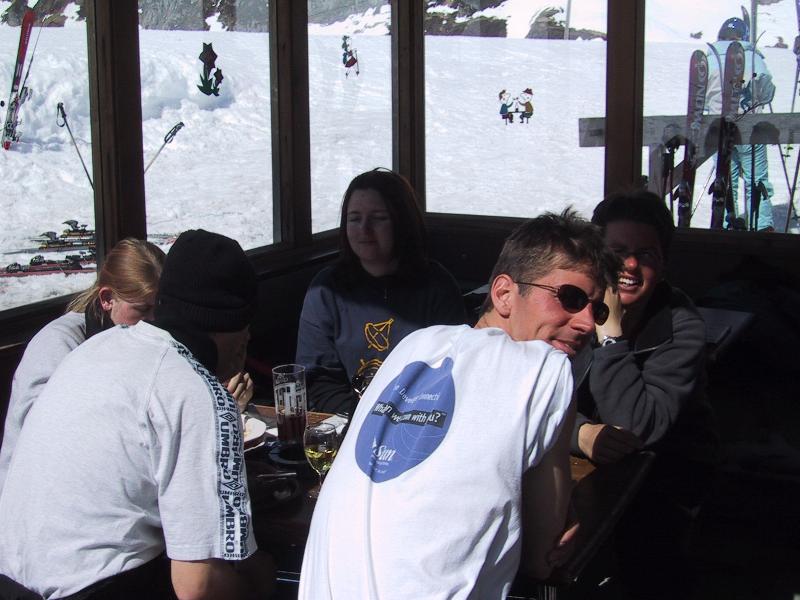 Mittagspause am Oberalp. Man geniesst das feine Essen und die Sonne.
