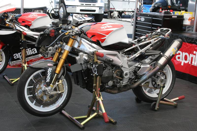 Aprila RSV Mille von Benny Thomson und Chaz Davis. Schön, dass hier noch 1000er Twins fahren!